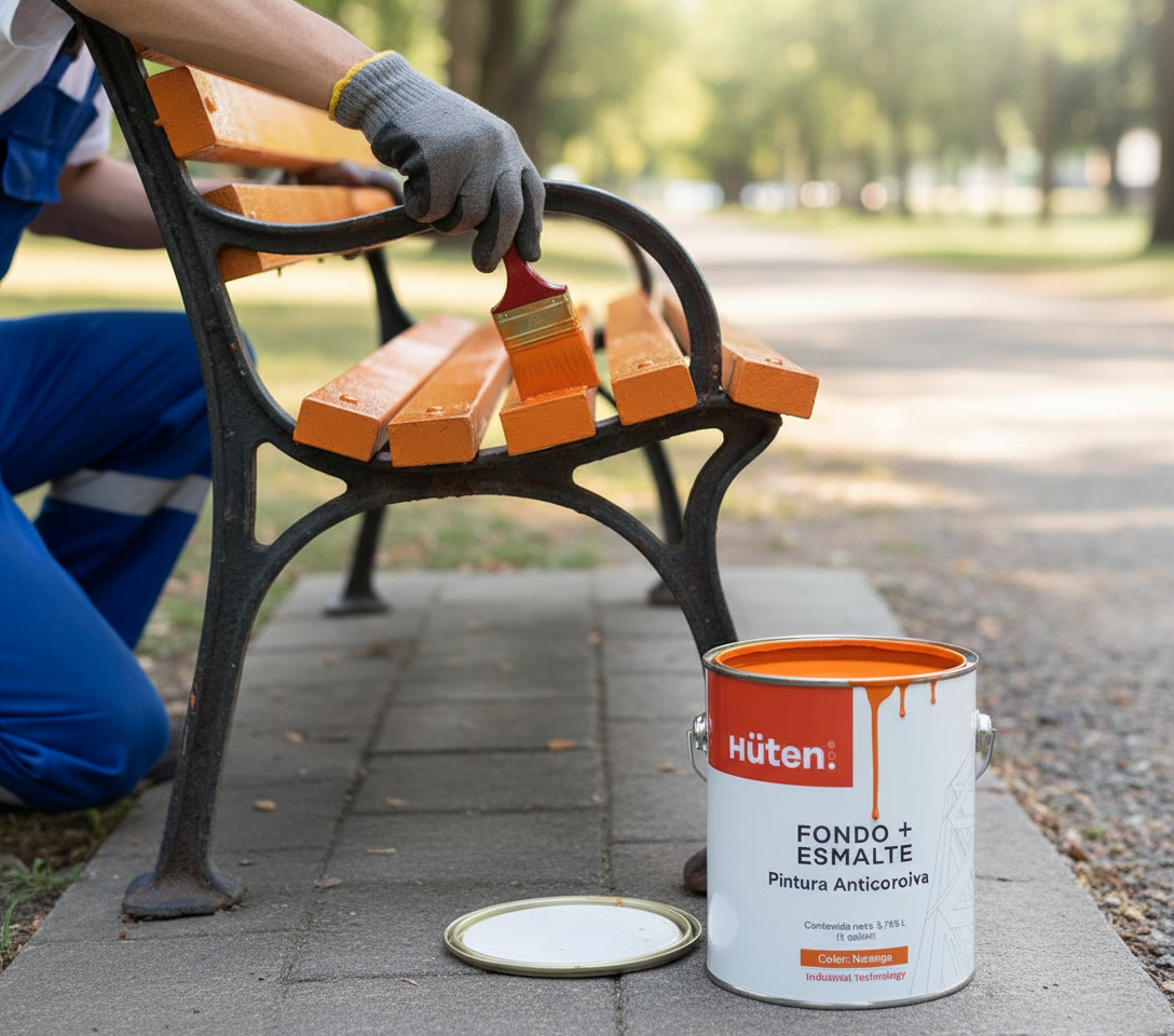 Mientras otras pinturas requieren varias manos y elevan costos, Huten integra fondo y esmalte en un solo producto, asegurando proteccion duradera y brillo en bancos de madera y metal.