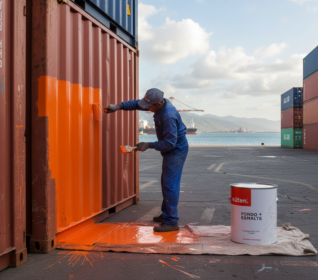 La Pintura anticorrosiva para contenedores (list of items to generate paraphrased variations for) Huten es una formulacion 2 en 1 que actua como fondo y esmalte en una sola mano para proteger contenedores y cajas metalicas frente a ambientes marinos o industriales, con secado rapido y gran resistencia al impacto y abrasion.