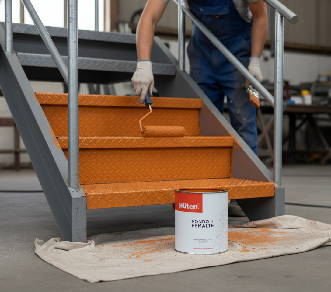 La Pintura anticorrosiva para escaleras metalicas Huten es un recubrimiento 2 en 1 diseñado como fondo y esmalte en una sola aplicacion para proteger peldaños y estructuras de escaleras metalicas, con secado rapido y acabado antideslizante opcional.