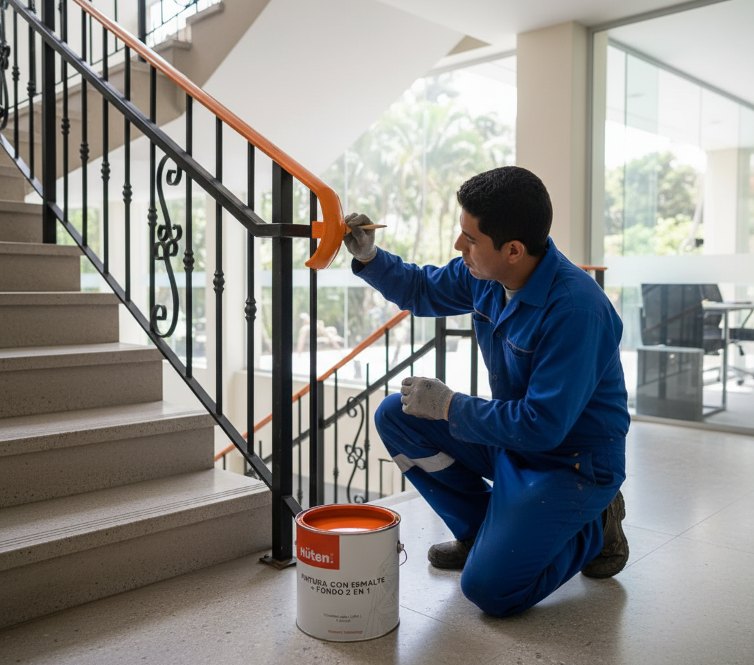 La Pintura anticorrosiva para pasamanos metalicos Huten es una formulacion 2 en 1 que actua como fondo y esmalte en una sola aplicacion para proteger y embellecer pasamanos en espacios publicos y residenciales, con secado rapido y tacto agradable.