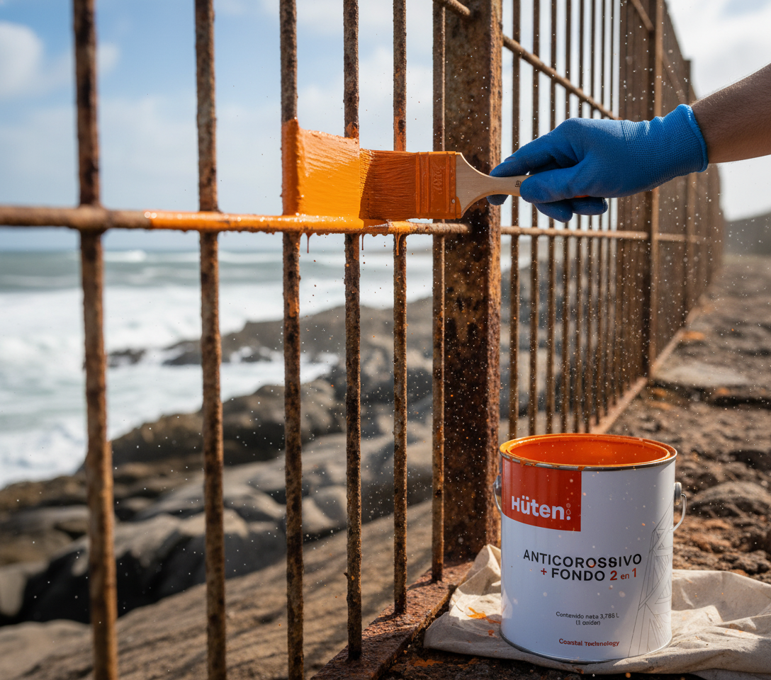 Pintura anticorrosiva resistente al salitre es la alternativa Huten para rejas y estructuras metalicas en zonas costeras, formulada con fondo y esmalte listos para aplicar que protegen frente al salitre y la corrosion marina, con secado rapido y alto rendimiento; disponible en pinturas Huten en Venezuela junto a esmaltes e impermeabilizantes.